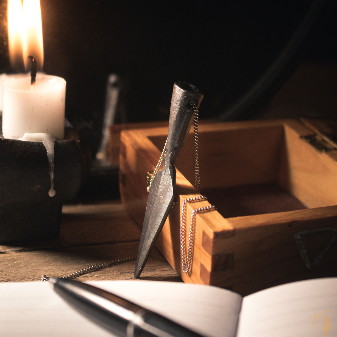 Spjutet var i många forntida kulturer det ultimata verktyget för syfte och riktning, ett vapen som gjorde det möjligt att träffa direkt mot ett mål. I den nordiska mytologin förkroppsligade Gungnir, Odens legendariska spjut, detta perfekt – det sades aldrig missa sitt mål. Detta handsmidda järnspjutspetshänge hämtar inspiration från den kraftfulla arketypen, som symboliserar fokus, ofelbar avsikt och drivkraften att träffa målet i dina egna livssträvanden.