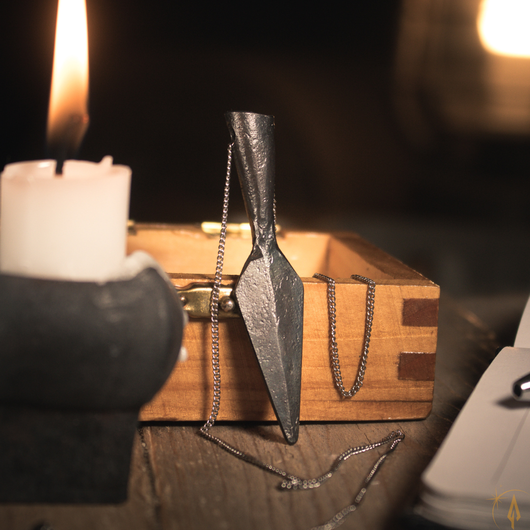 Tillverkad med syfte: Detta hängsmycke är handsmitt av järn, format vid städet till den distinkta formen av ett spjutspets. Spetsen är noggrant formad och hylsan är integrerad, vilket återspeglar den skicklighet som krävs för att skapa en funktionell och balanserad miniatyr-representation av detta forntida vapen. Den hamrade texturen över ytan säkerställer att varje smycke är unikt och bär den autentiska karaktären av metall formad av eld och kraft.