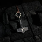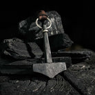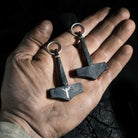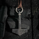 Tillverkad med syfte: Handsmidd av järn, detta Mjölnir-hänge förkroppsligar den orubbliga styrkan och hållbarheten hos Tors egen hammare. Smeden formar järnet med kraftfulla hammarslag och bildar det distinkta huvudet och handtaget.
