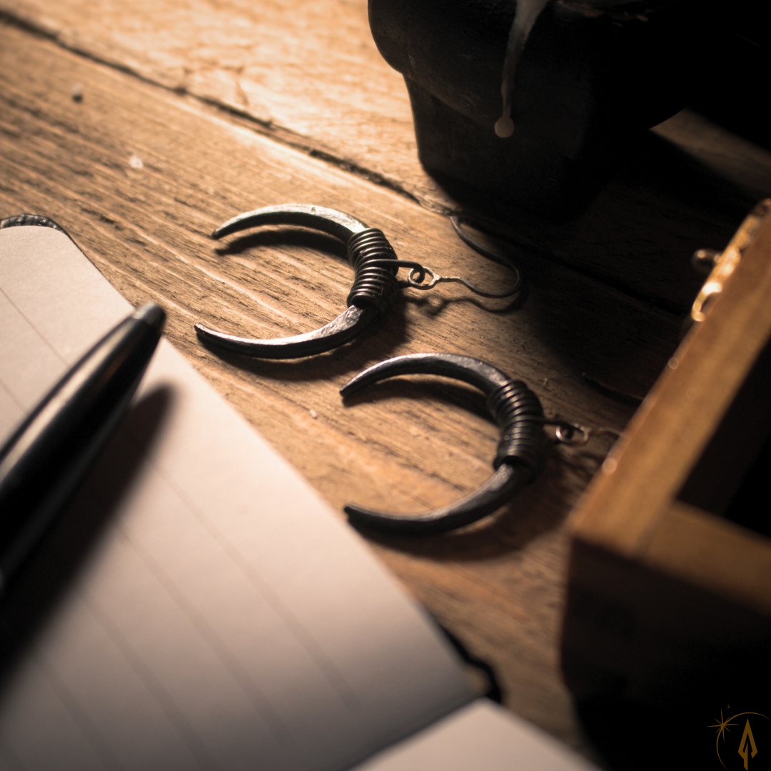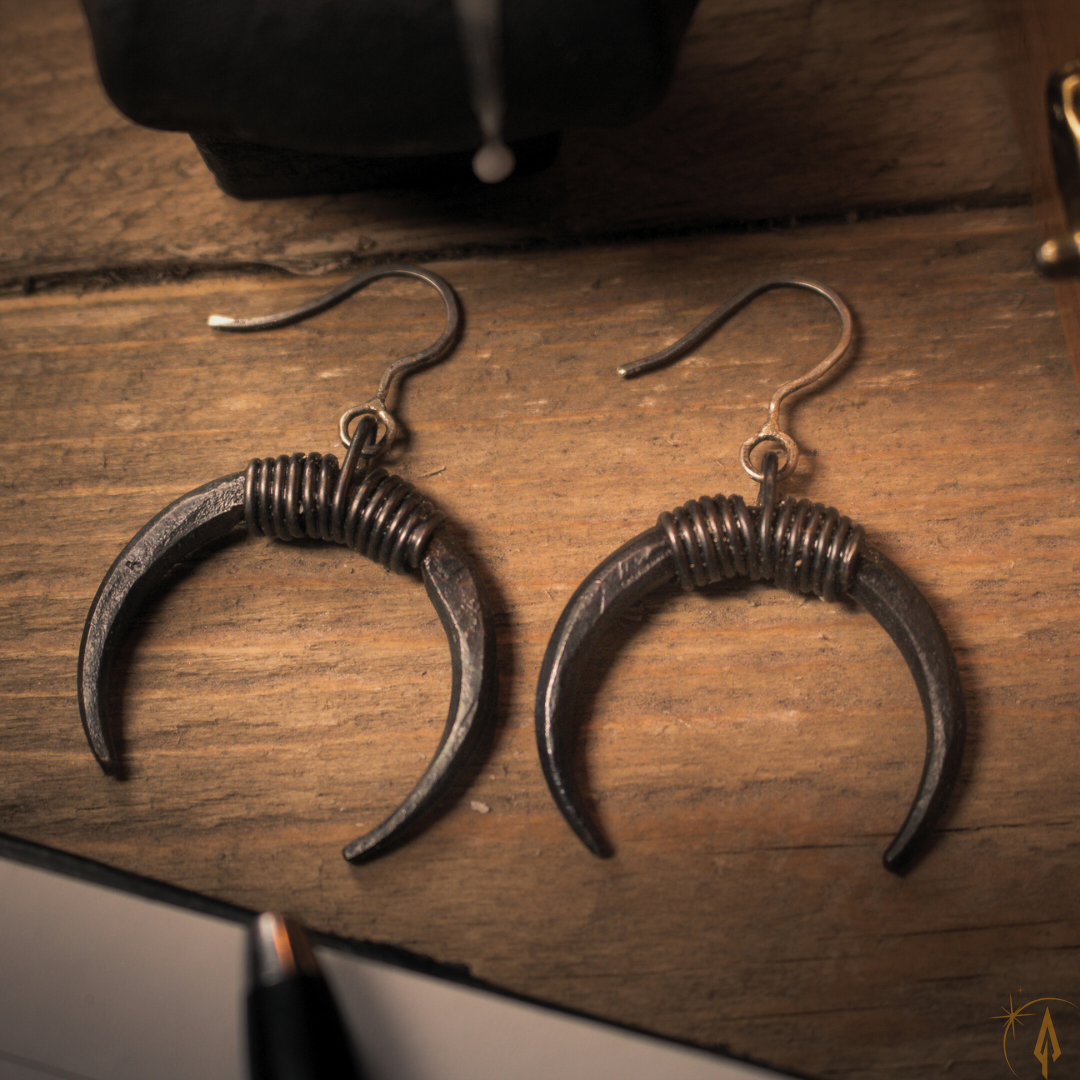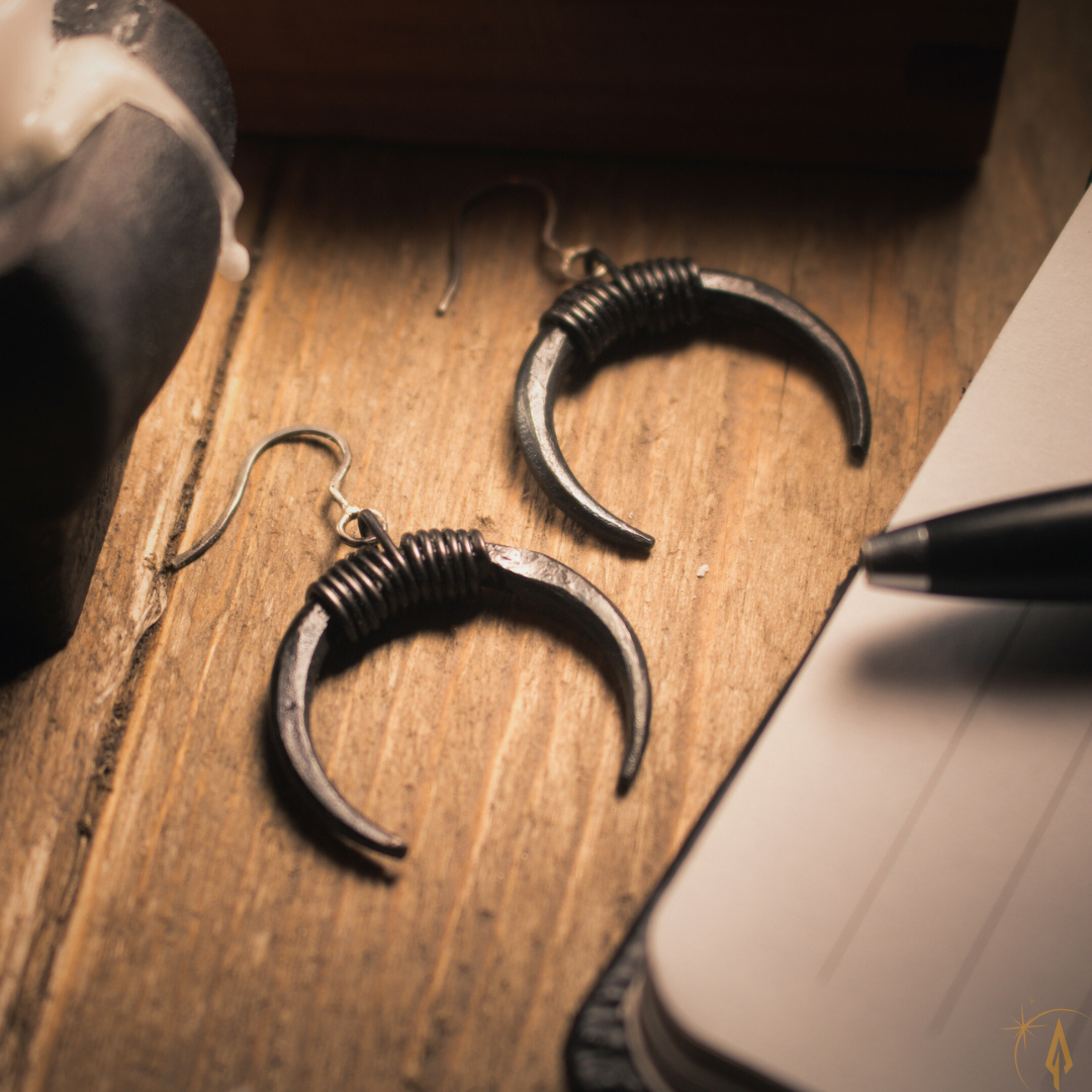 Månskäran, skarp och ljus på natthimlen, är en kraftfull symbol för nya början, spirande potential och det ständigt roterande hjulet i kosmiska cykler. Den representerar ögonblicket före fullhet, laddat med förväntan och stilla kraft. Dessa örhängen fångar den uråldriga formen och kombinerar den jordade styrkan hos smidd järn med silvrets månsken.