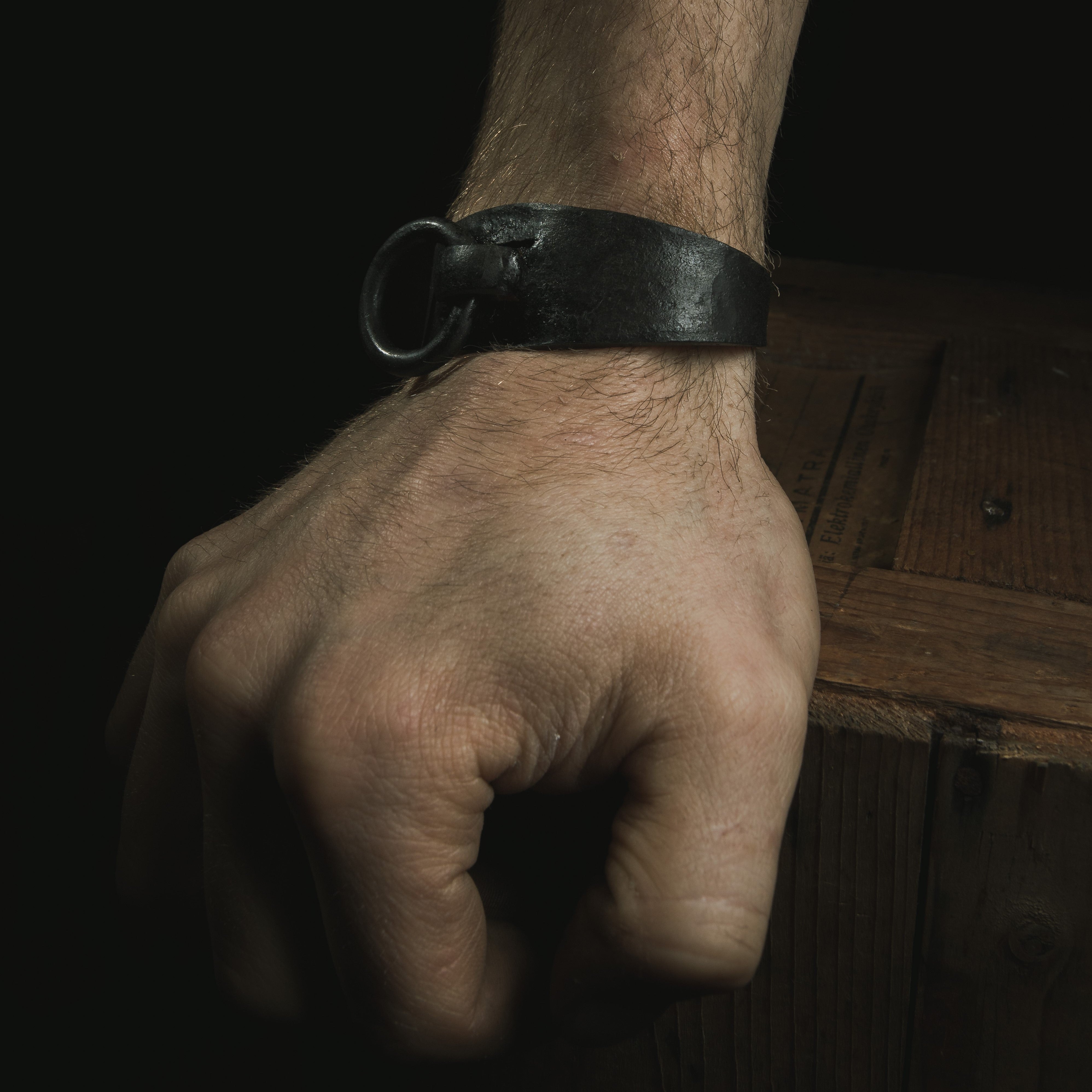 Tillverkad med syfte: Armbandet är handsmitt av järn, format vid städet till ett robust uttryck, designat för bekvämt bärande. Ytan bär den autentiska strukturen som smedens hammare lämnat. En separat, mindre ring är smidd och sedan fäst i armbandet på ett sätt som gör att det kan röra sig fritt. Detta kräver exakt hantverk, som säkerställer integriteten hos båda delarna samtidigt som man skapar ett övertygande visuellt och taktilt element. Det är ett bevis på smedens förmåga att genomsyra metall med både styrka och rörelse.