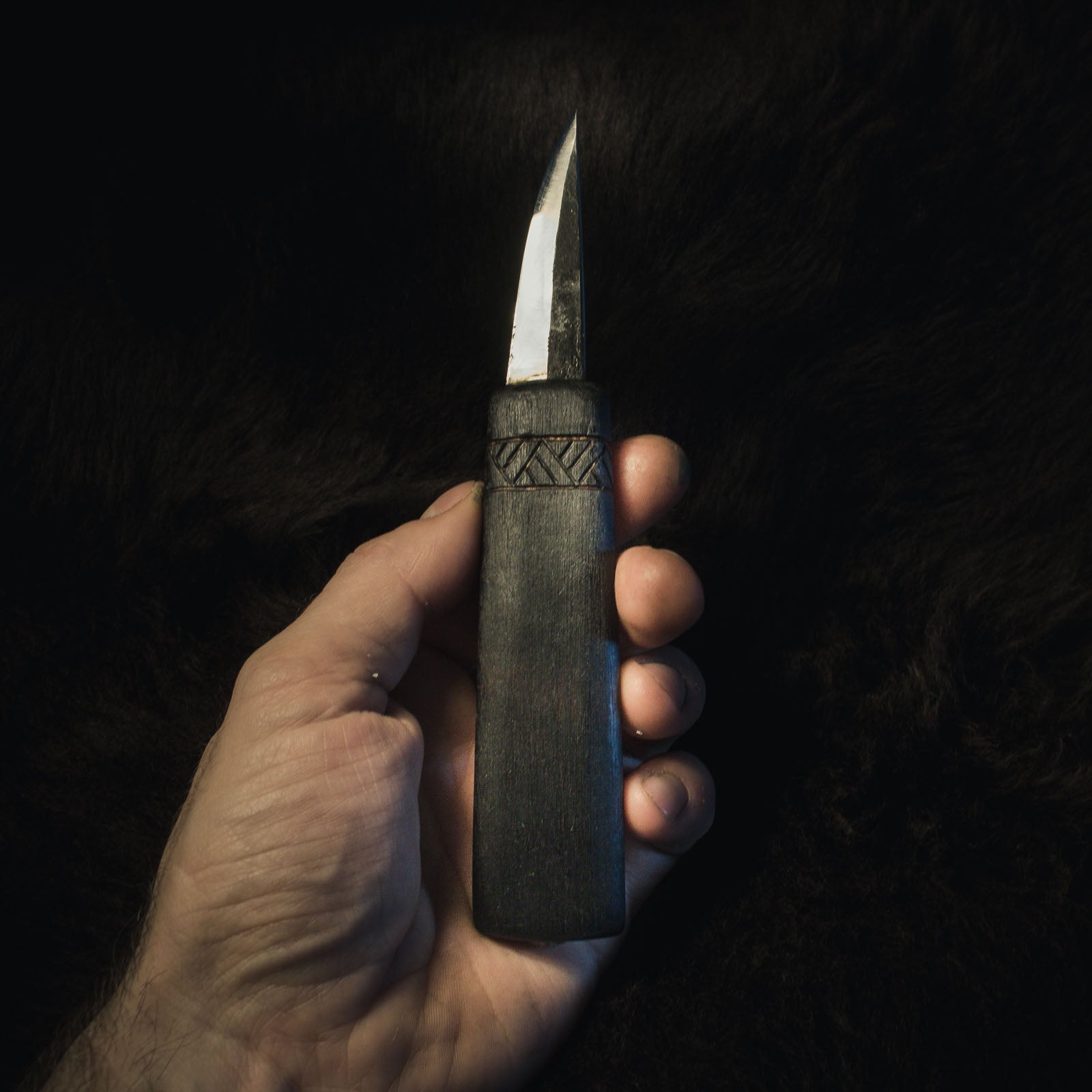 En symbol för din berättelse: En välgjord kniv är en förlängning av viljan, ett verktyg som låter dig forma världen omkring dig, oavsett om det är genom invecklad täljning eller praktiska uppgifter. Denna kniv, med sitt handsmidda blad och naturliga handtag, talar för tillfredsställelsen av att arbeta med autentiska material och stoltheten över skickligt hantverk. Låt den vara en symbol för ditt engagemang för ditt hantverk eller dina sysselsättningar, och en påminnelse om det avtryck du kan göra när du är utrustad med rätt verktyg och finslipad skicklighet.