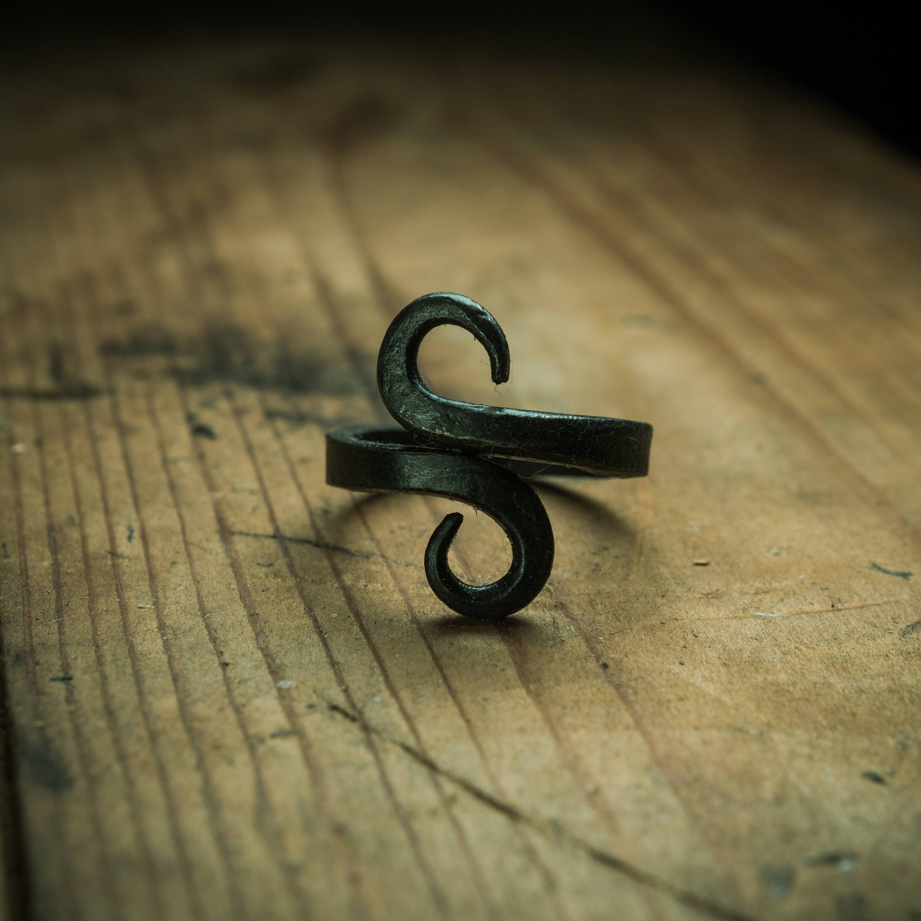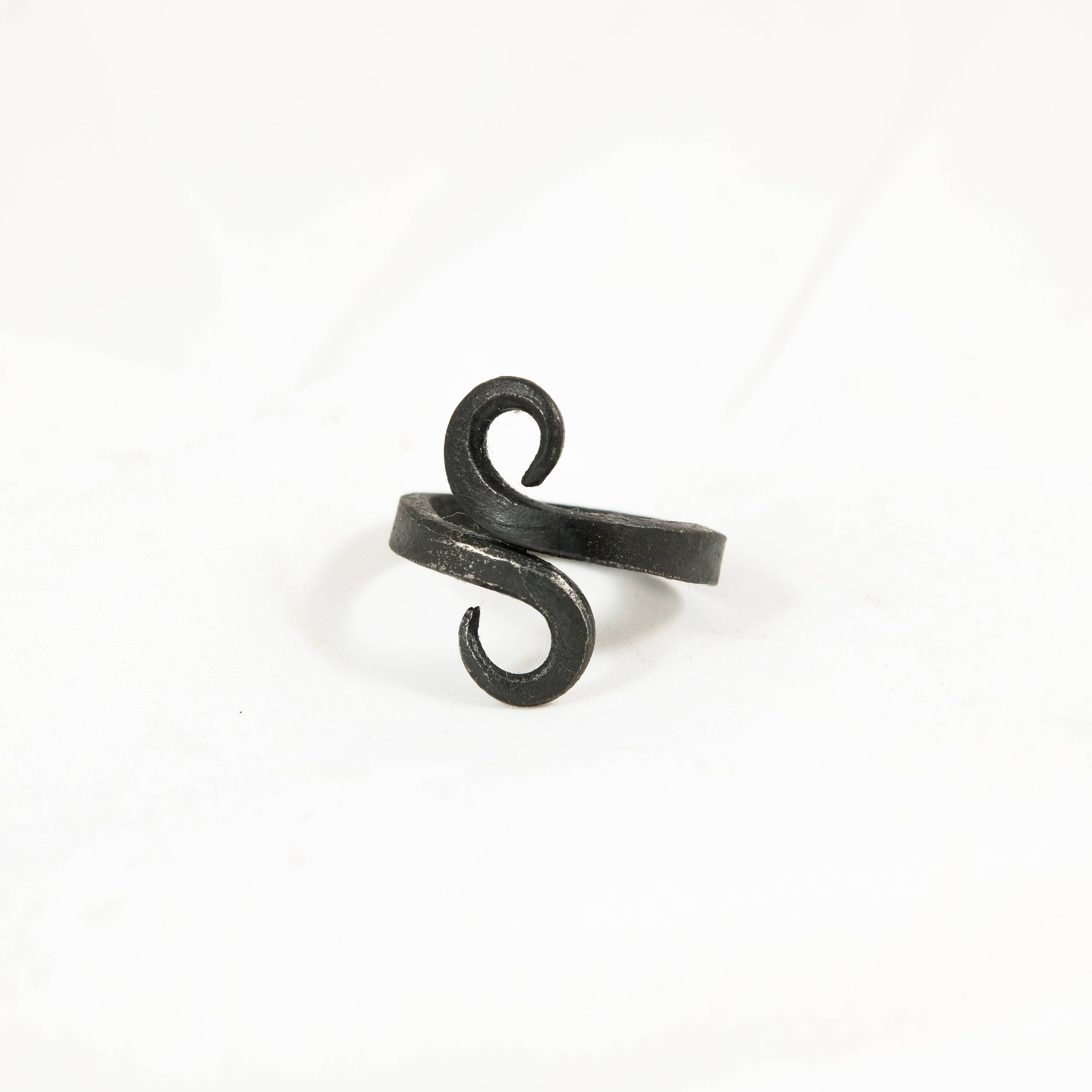 Tillverkad med syfte: Handsmidd av järn, denna ring är formad individuellt av smeden. Bandet formas och sedan böjs ändarna till dekorativa böjar, överlappande där de möts. Processen lämnar synliga hammarmärken och en unik textur på järnet, vilket säkerställer att även om designen är konsekvent, har varje ring sin egen karaktär. Det är ett stycke bestående kvalitet, format med både styrka och konstnärskap i åtanke.