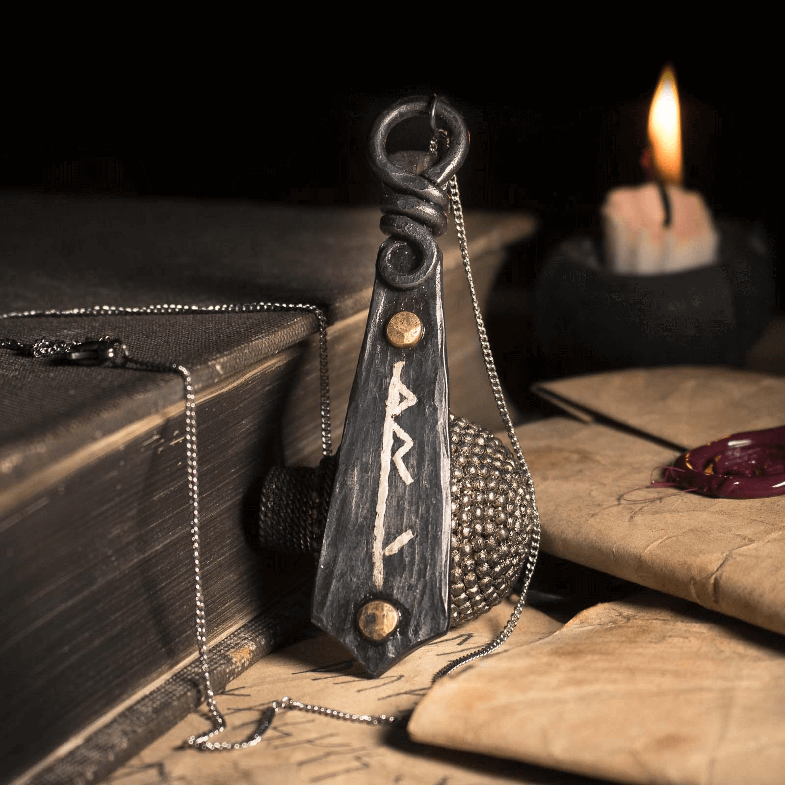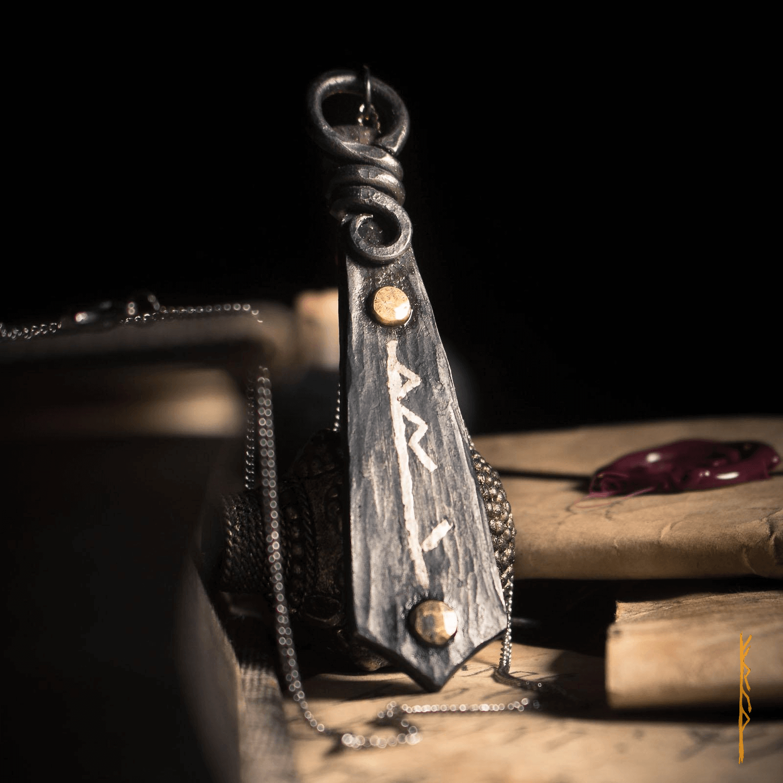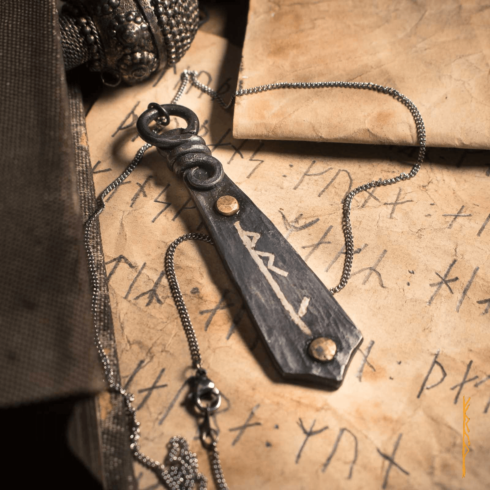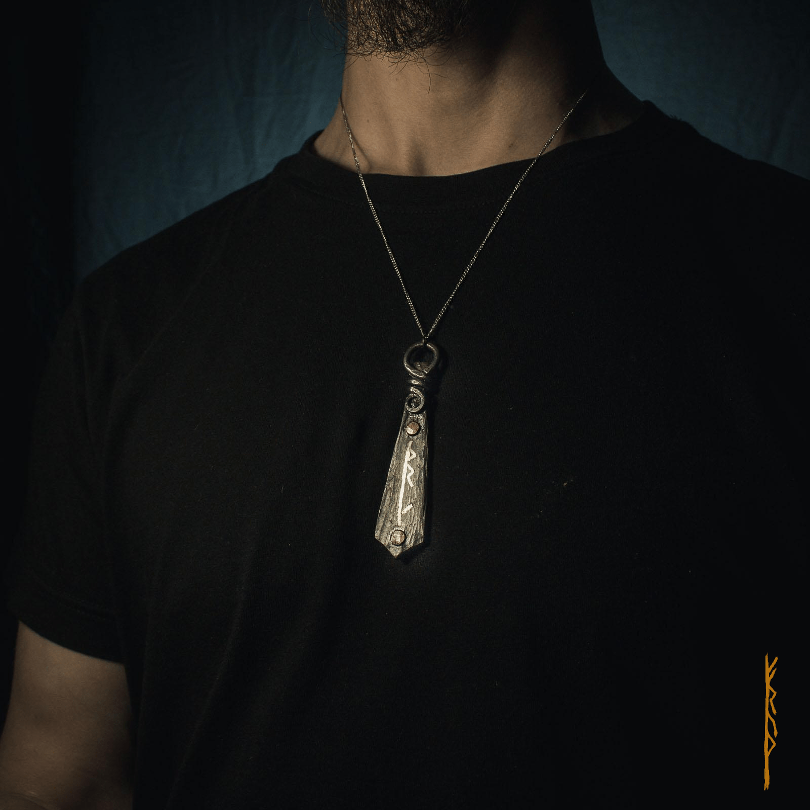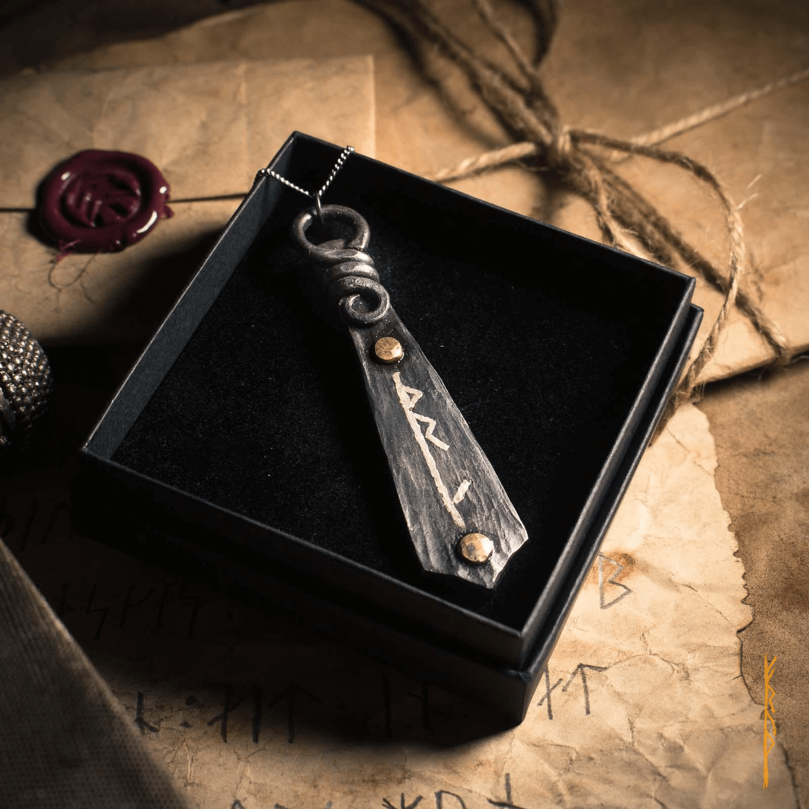 Tillverkat med syfte: Detta smycke är handsmidet av robust järn. Med hjälp av traditionella smidestekniker värms järnet upp, hamras och formas, vilket avslöjar dess inneboende textur och styrka. En noggrant utformad bindruna i silver, vald från ett urval av kraftfulla symboler, integreras sedan i hänget, vilket lägger till ett lager av fokuserad avsikt. Två massiva mässingspärlor är infattade som accenter, deras varma glöd en motpunkt till det mörka järnet, varje detalj formad med avsiktlig skicklighet och respekt för materialen. Resultatet är ett smycke av bestående kvalitet och äkthet, ett bevis på smedens hantverk.