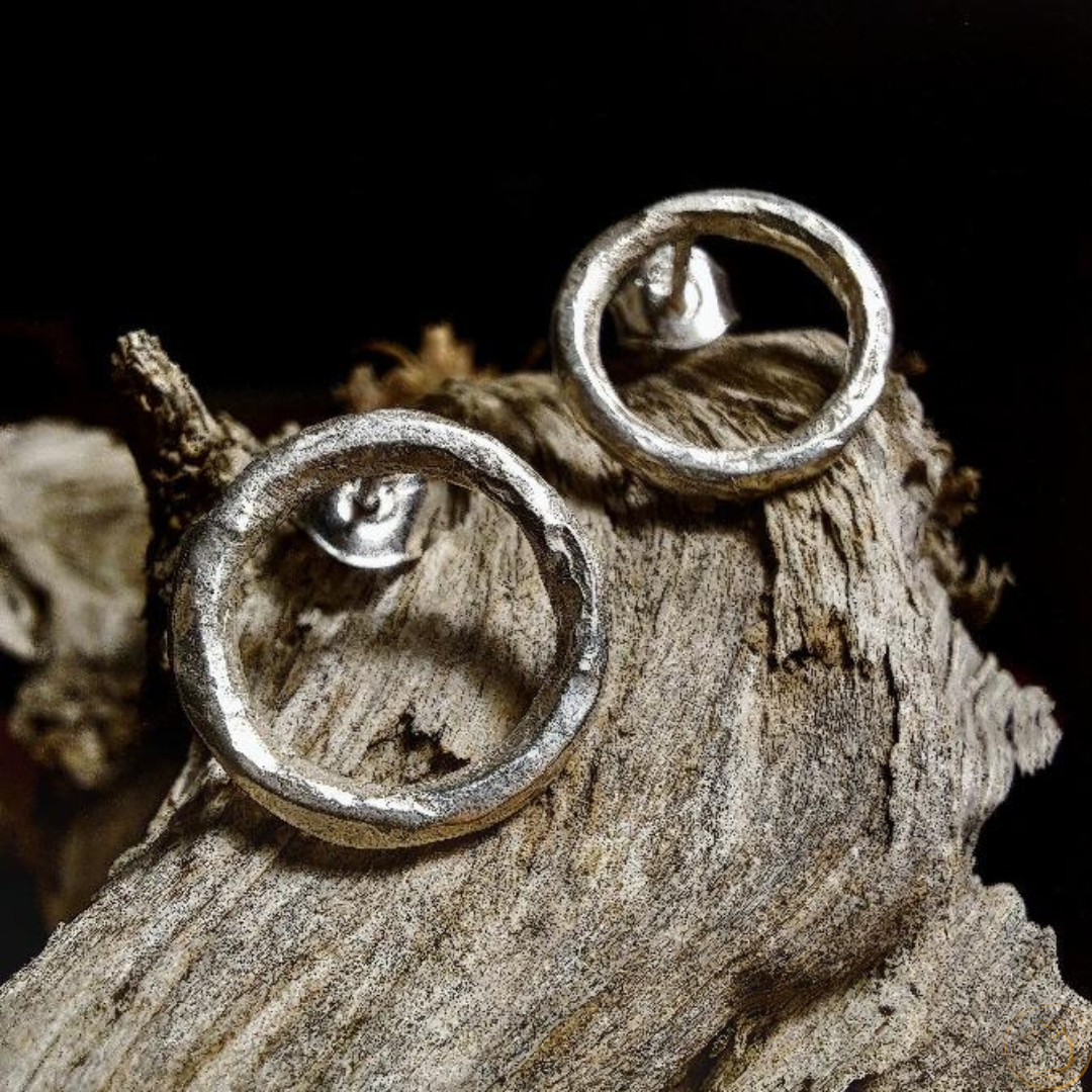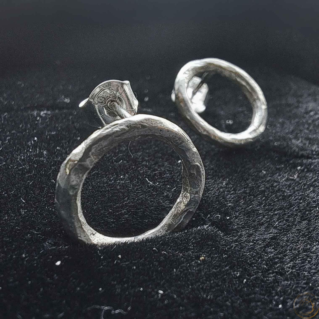 Dessa örhängen bär samma råa, autentiska skönhet som de andra smyckena i den här kollektionen. Deras ytor är levande med de unika mönster som smedens hammare lämnat – inte defekter, utan avsiktliga märken. De är ett tyst uttalande i en värld av tillverkad likformighet, som förbinder bäraren med den uråldriga traditionen att forma metall för hand. Varje kurva och fasett reflekterar ljuset på ett sätt som bara handhamrad metall kan, en subtil dans som talar om eld, kraft och mänsklig skicklighet.
