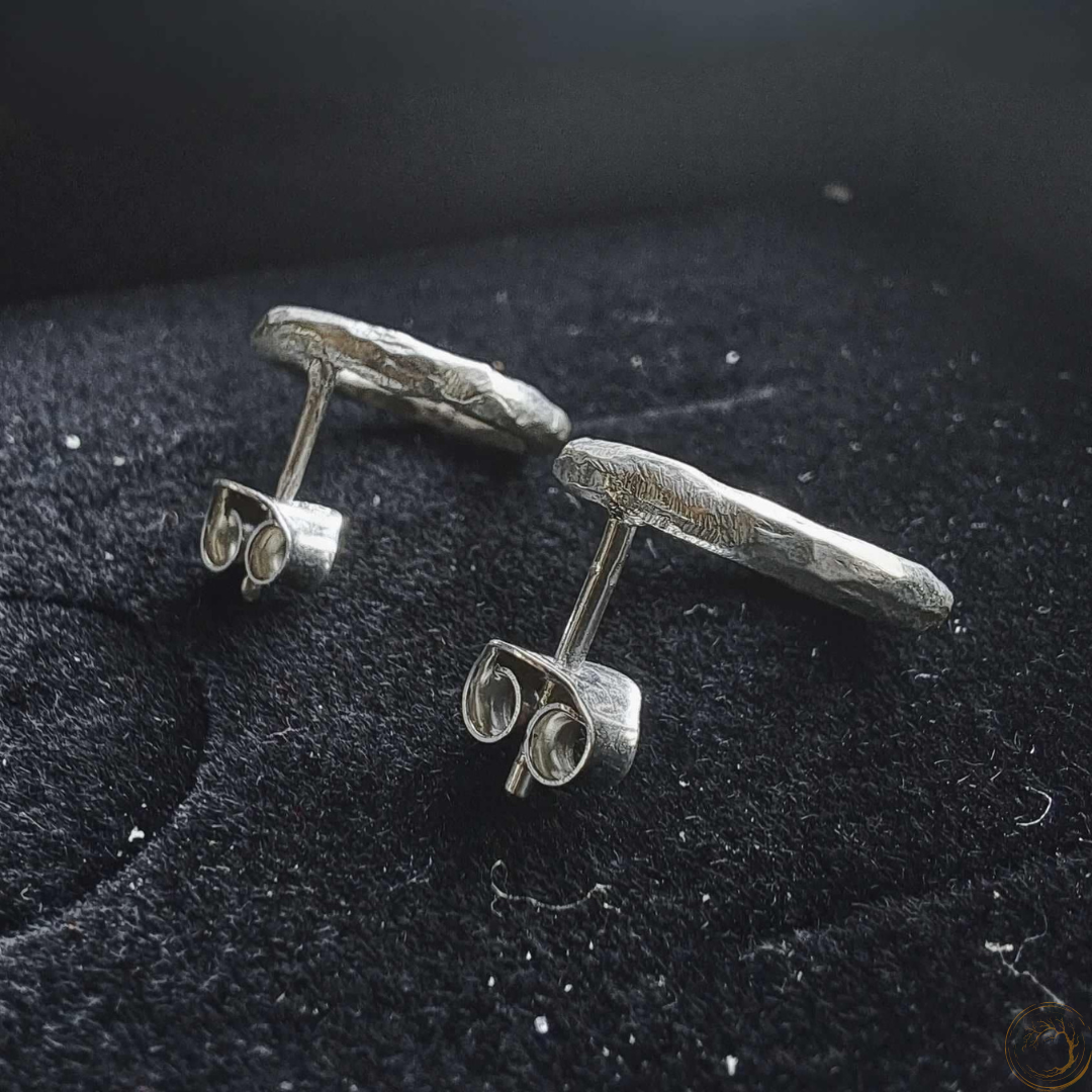Tillverkade med syfte: Varje örhänge är noggrant handsmitt av sterlingsilver. Metallen formas och textureras med en hammare, vilket resulterar i ett unikt mönster på varje örhänge. Denna process säkerställer att de, även om de är ett par, har en subtil, organisk asymmetri – den vackra ofullkomlighet som är inneboende i äkta handarbete. Lätta men ändå subtila i sin närvaro, erbjuder dessa örhängen en påtaglig koppling till smedjan och smedens bestående hantverk.