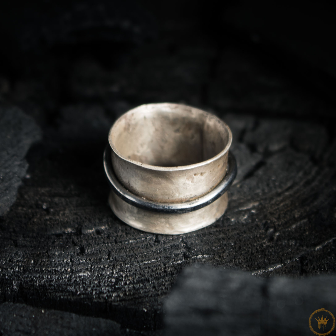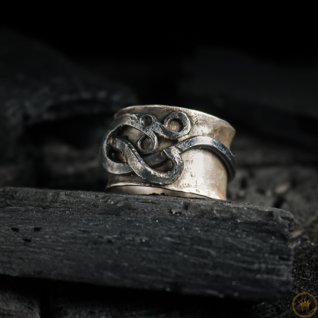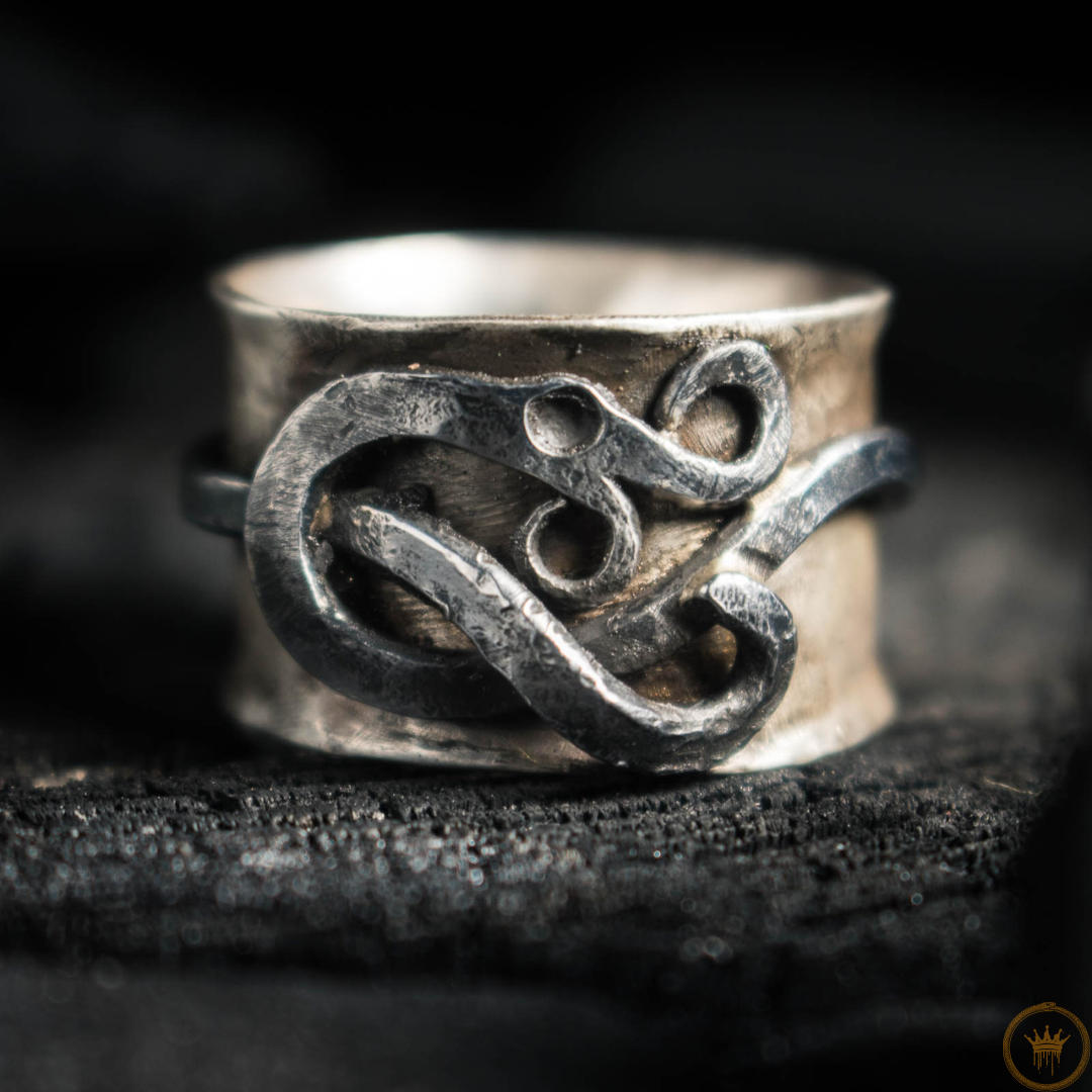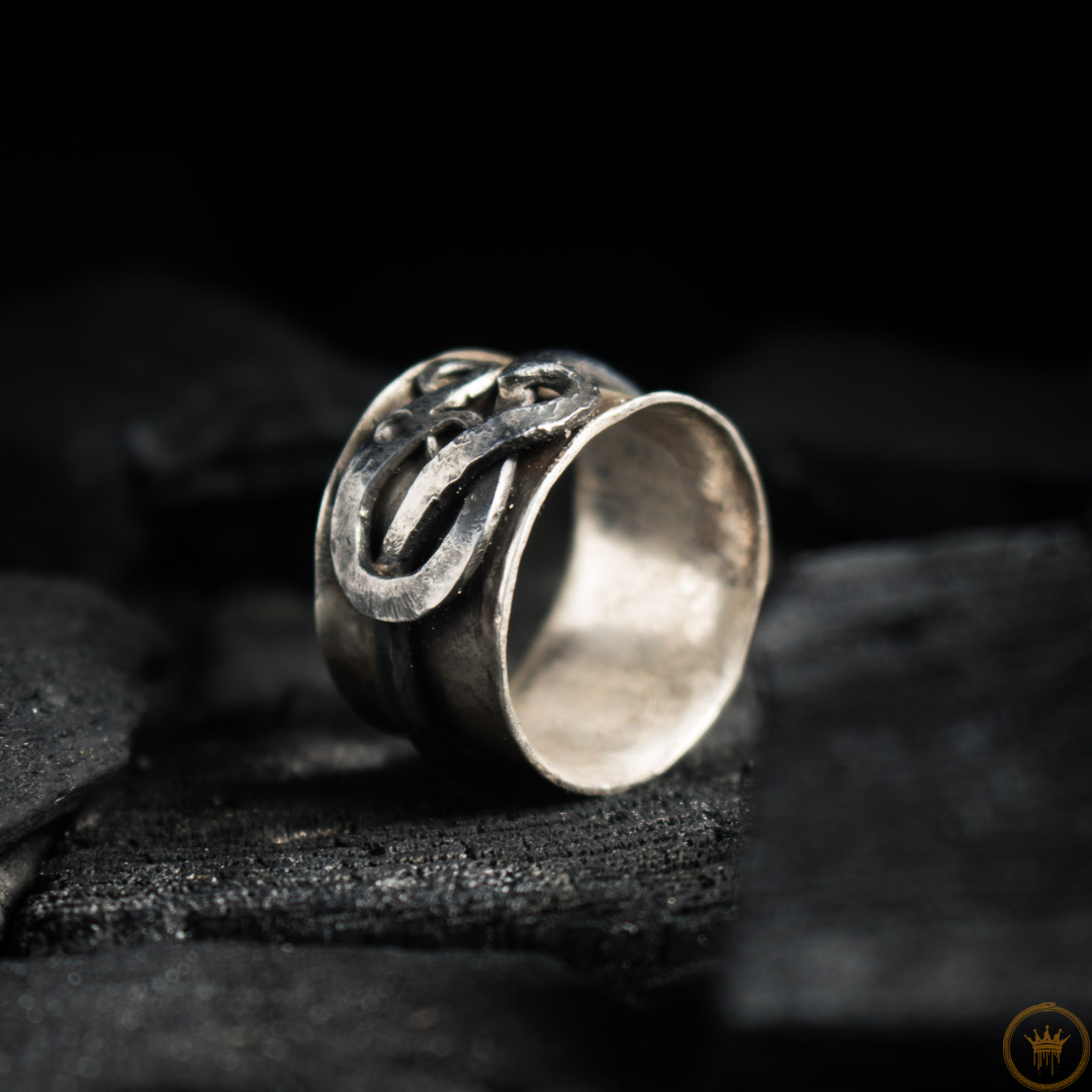 I myter och historier är ormen en kraftfull och komplex symbol. Den representerar cykler av liv, död och återfödelse genom att huden fälls; den förkroppsligar visdom, läkning och beskydd; i vissa berättelser är det den uråldriga kraften som omger världen eller vaktar dold kunskap. Denna ring fångar essensen av denna kraftfulla symbol, återgiven i en slående kombination av silver och smitt järn. Den talar om den sammanflätade naturen av elegans och rå styrka, och drar inspiration från uråldriga arketyper som resonerar genom tiderna.