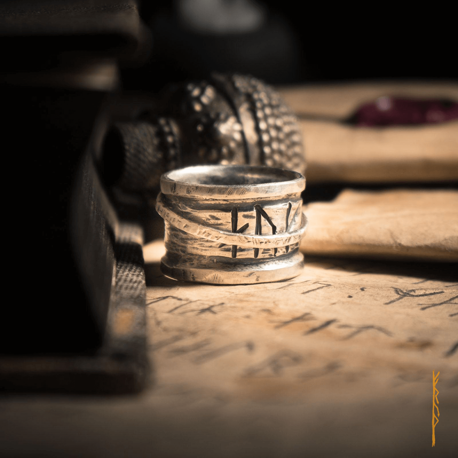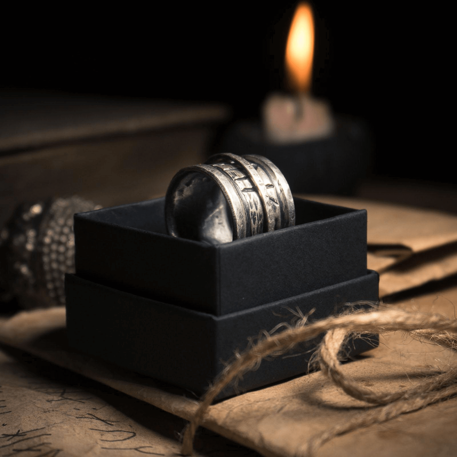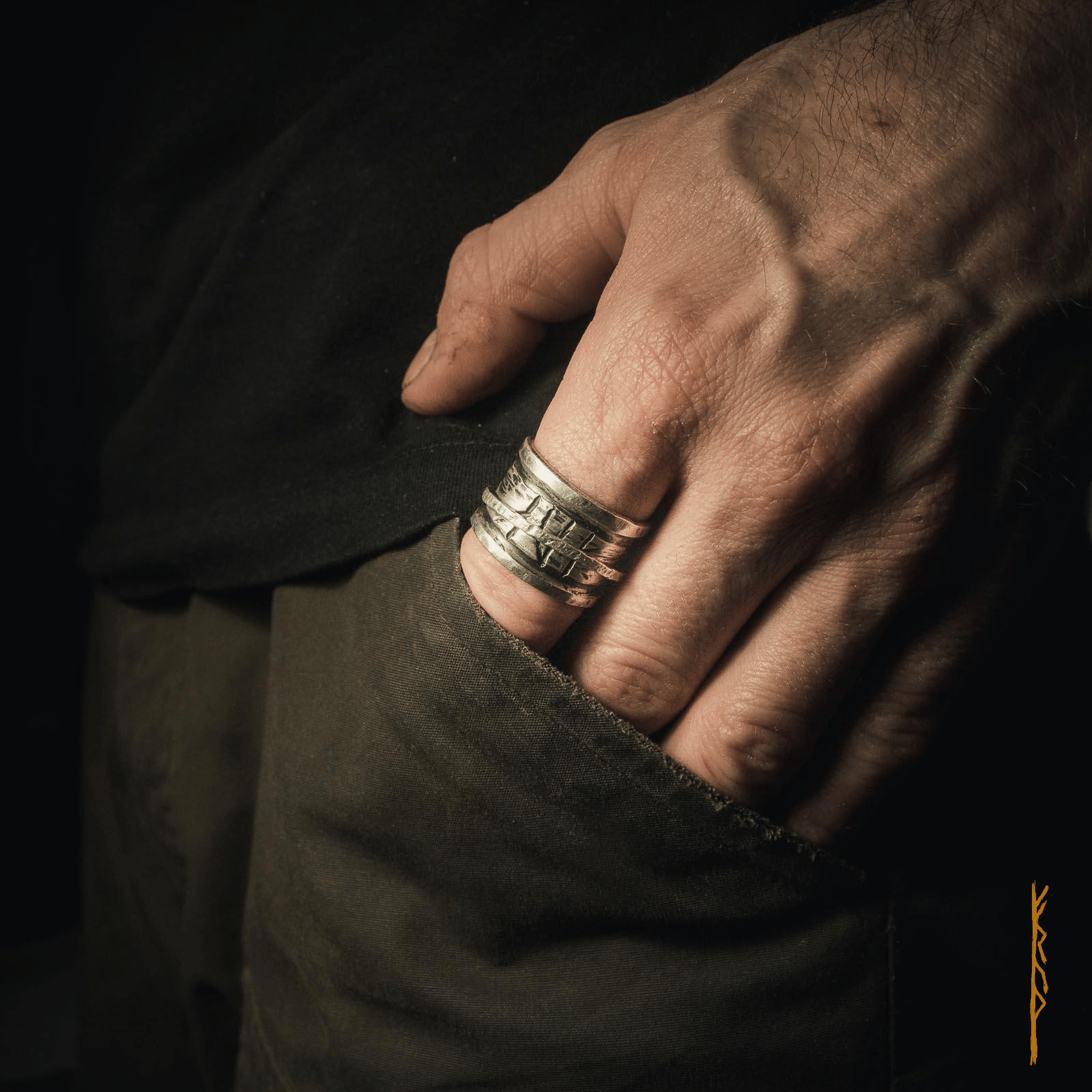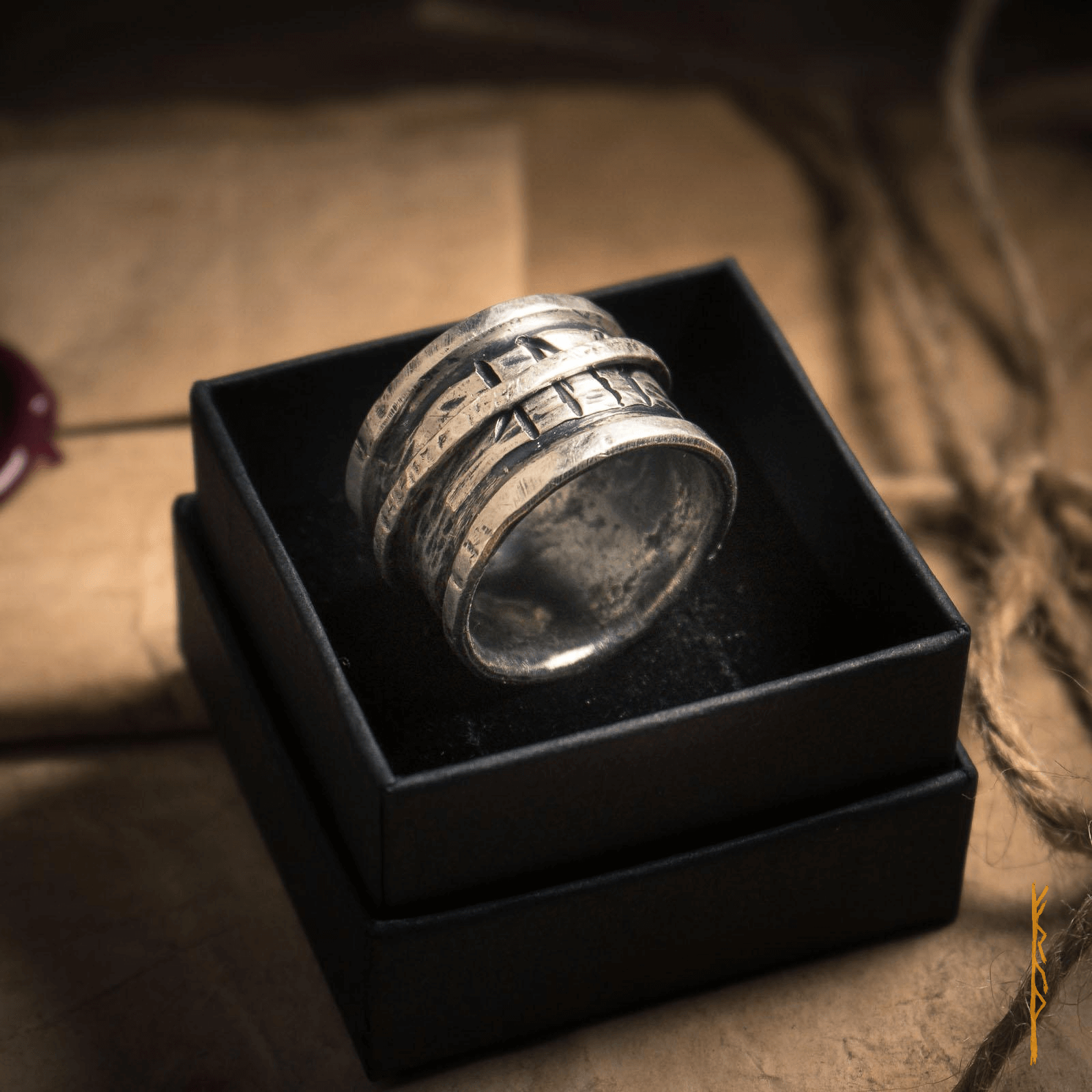 En symbol för din berättelse : Denna ring fungerar som en kraftfull symbol för dem som aktivt skapar sin egen väg. Välj att pryda den med den forntida runskrift – symboler för visdom, vägledning och kraft – för att bära med dig ekon från det förflutna. Den valfria spinner-ringen kan representera tidens ständiga vändningar, livets cykler eller fungera som ett grundande fokus under stunder av reflektion. Det är ett smycke som förkroppsligar styrka, påminner dig om din motståndskraft och en markör för den episka resa du är på. Bär den som en påminnelse om var du har varit och ett ankare för vart du är på väg, och lämnar ditt unika avtryck på världen.