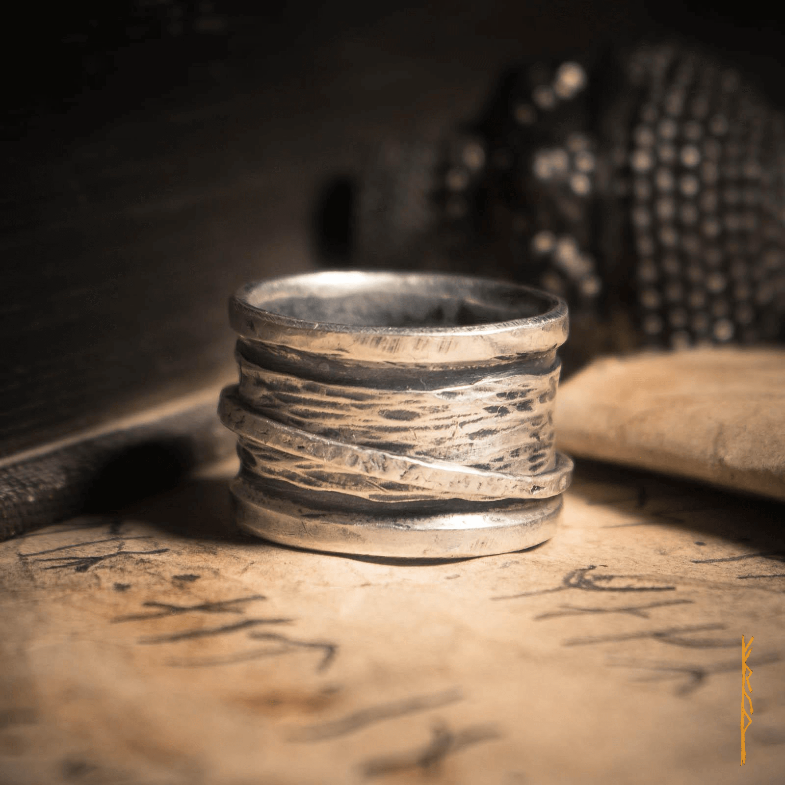 Tillverkad med syfte : Detta smycke är handsmitt av massivt sterlingsilver. Med hjälp av traditionella smidestekniker formas och sammanfogas silverlager noggrant, vilket skapar ett rejält band med en autentisk, taktil textur. Varje hammarslag berättar en historia, vilket säkerställer att varje ring är unikt född ur smedjan. Det valfria spinner-ringen är noggrant integrerat, ett slätt, rörligt lager inuti det stadiga bandet.