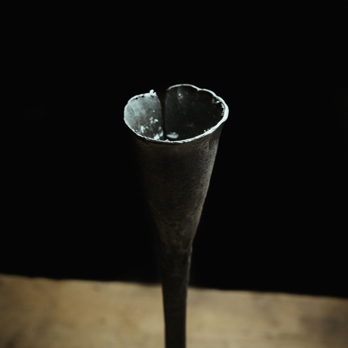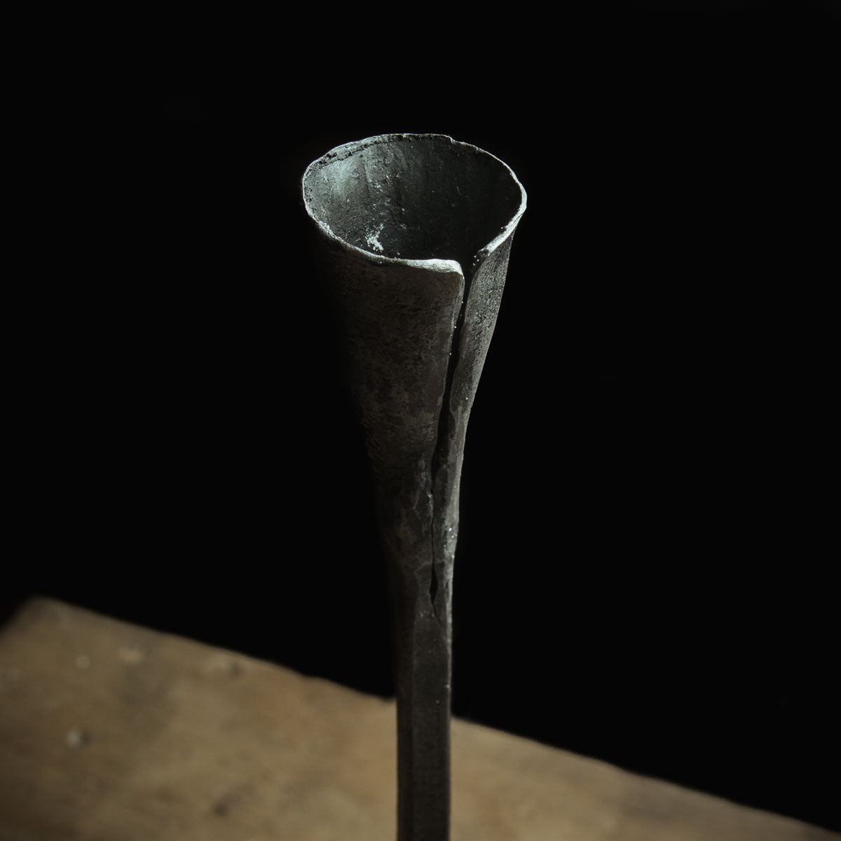 Tillverkad med syfte: Denna ljusstake är handsmidd av massivt järn, format vid städet. Den eleganta skaftet reser sig från en stabil bas och kulminerar i en noggrant formad kopp för att hålla ljuset. Varje kurva och detalj är resultatet av smedens skicklighet, som ger proportioner och karaktär åt metallen. Ytan behåller hammarens autentiska textur, vilket gör varje smycke till ett unikt konstverk och en påtaglig koppling till traditionell metallbearbetning.